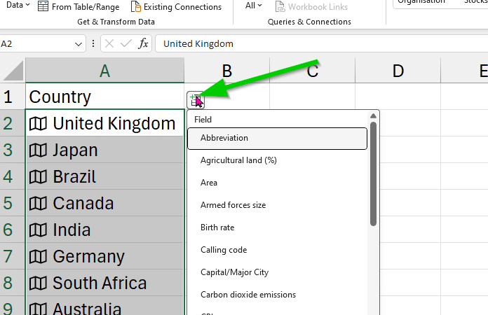 Looking closely you can see that I’ve highlighted the above icon in Excel with a green square. This icon, which looks like a card, represents a linked data type. So from now on when you enter a countries name, Excel recognises it as a geography data type.
